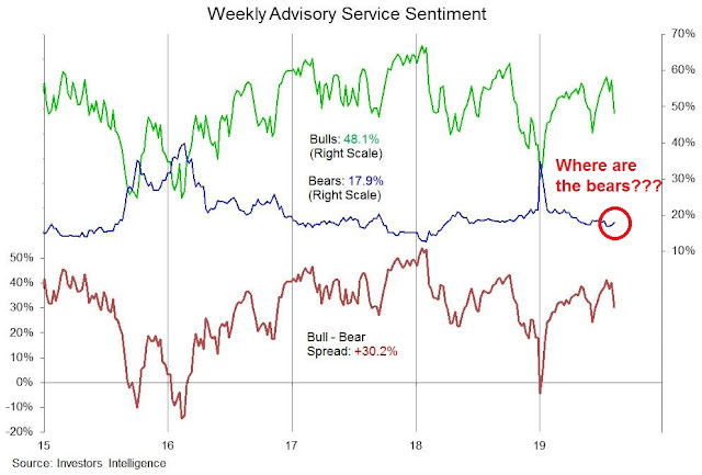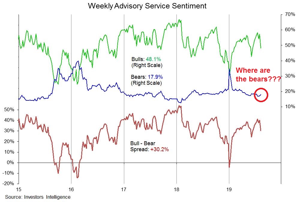 Five market sectors have hit record highs this year. Three of them are bond proxies like REITs, utilities, and consumer staples. All three are also defensive in nature and usually lead major market advances in the late stages of a bull market. The two others to hit new highs are consumer discretionary, which is more economically-sensitive, and technology. Tech traditionally does better when investors are looking for growth that isn’t available elsewhere. That’s not exactly a vote of confidence.