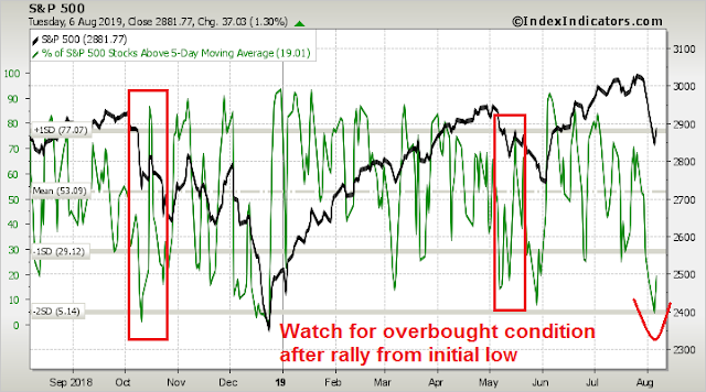 If you did jump on the long trade, another way of timing the exit is to monitor the % above 5 dma indicator. Wait for it to recover back into an overbought condition, just as it did during past episodes where the market fell to an initial low and then recovered as part of a longer term correction.
