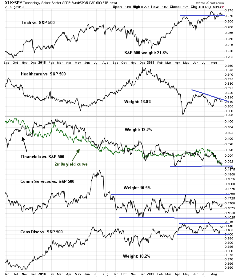 A look at the top five sectors, which comprise nearly 70% of index weight, tells a different story. With the exception of Technology, which is exhibiting a constructive leadership pattern, all of the other sectors are either lagging or range-bound on a relative basis. The stock market cannot rise without the strong participation of these heavyweights, which is more or less nonexistent.