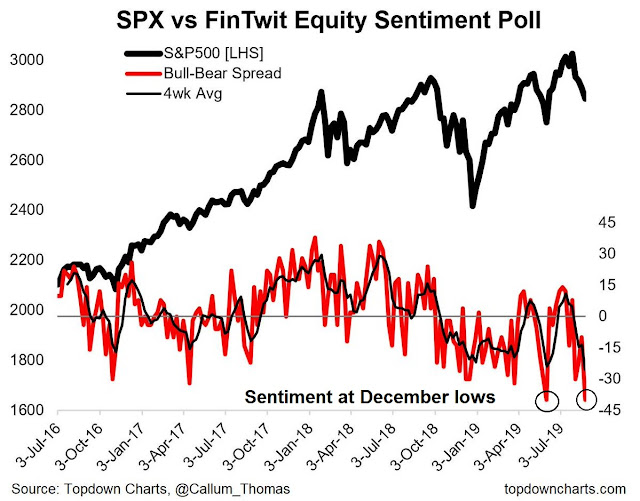 The latest Investors Intelligence sentiment survey tells the story. Bullish sentiment has dropped considerably, which can be a sign of a short-term bottom. On the other hand, bearish sentiment has barely budged. and it has not spiked to signal the panic consistent with a durable intermediate term bottom.