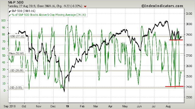 Before the bulls get overly excited, the current up-and-down pattern may not support a sustainable rally. While sentiment and breadth metrics are either oversold, or at bearish extremes, readings are highly fickle, and volatile on a daily basis. We have not seen the kind of consistent selling that usually characterizes a wash-out bottom yet.