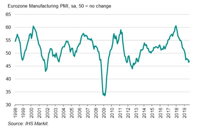 Eurozone manufacturing PMI remained in contraction territory in August, though conditions improved from July. Intermediate and investment goods sectors remained in a downturn, while consumer goods saw a solid upturn. Germany, which has been the growth locomotive of Europe, is either in or nearing recession.