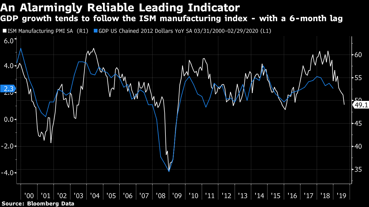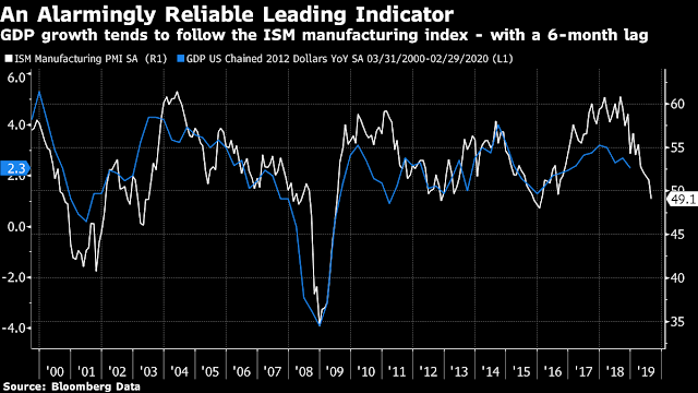 This is all rather alarming. John Authers pointed out that ISM tends to lead GDP growth by about six months, indicating soft growth ahead.