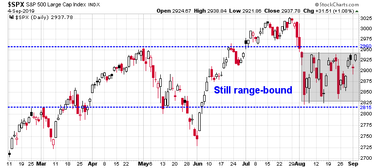 Mid-week market update: Global markets have taken a decided risk-on tone today on the news that Hong Kong leader Carrie Lam has withdrawn the controversial extradition bill. As well, the revolt in the British parliament has lessened the chances of a chaotic no-deal Brexit on October 31. On the other hand, the market was hit by some somber news earlier in the week, when the PMI reports revealed a slowing global economy.