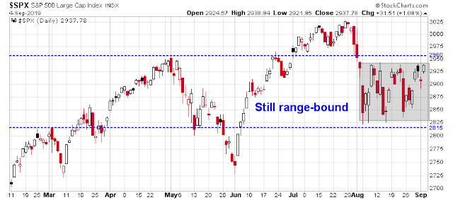 My inner investor remains defensively positioned, and he is underweight equities. Until stock prices break out of its trading range, my inner trader is continuing to buy the dips, and sell the rips. As the market is at the top of the range, he is maintaining a short position, with a stop loss set at just above 2970.