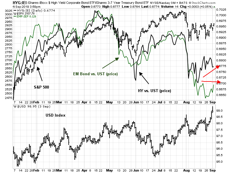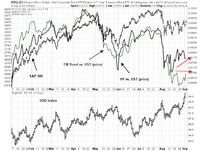 Another key risk is the strength of the USD. Greenback strength has pressured weak EM markets and economies. As the chart below shows, while the relative price returns of US high yield (junk) bonds have not confirmed the recent stock market strength, EM bonds have underperformed HY as the USD rose.