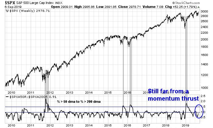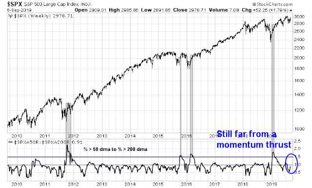 How far will the short covering rally run? Price momentum bulls should not put the cart before the horse. The chart below depicts the ratio of % above the 50 dma to % 200 dma as an indicator of price momentum. Past strong momentum thrusts that accompany market advances have seen the ratio spike above 1.5. Current conditions are far from a momentum thrust, and in fact, the ratio has not even exceeded 1.0 yet.