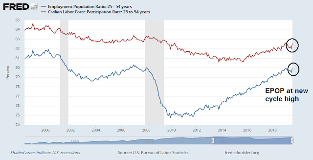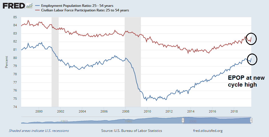Last Friday’s Jobs Report offers an example of a slowing, but non-recessionary, economy. The headline Non-Farm Payroll growth missed expectations at 130K, compared to an expected 160K. But internals reveal a picture of still robust employment. Both the prime age participation rate (LFPR) and the employment-population rate spiked, and prime age EPOP reached a new cycle high. These are not recessionary conditions.
