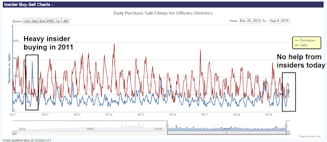 Perhaps as a result of the dirt cheap valuations, the 2011 bottom saw a cluster of heavy insider buying. On the other hand, there is no similar pattern of support from this group of “smart investors” today.