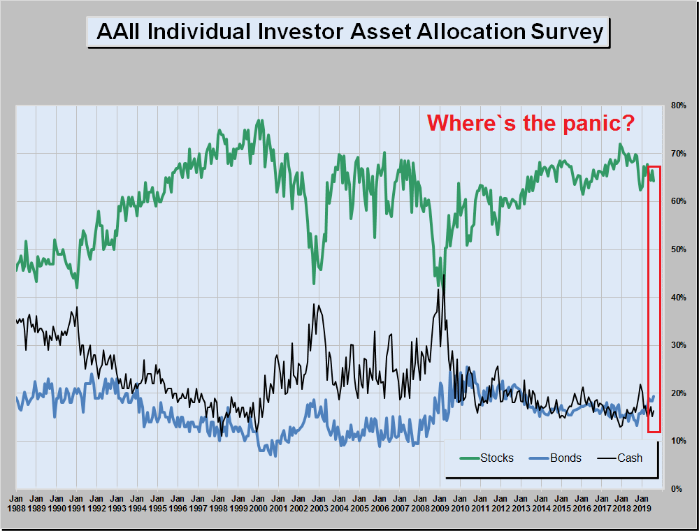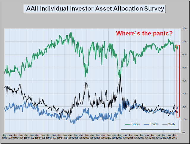 While the technical conditions are similar, there are a number of key differences. Let us start with sentiment, which was the principal basis for this rally. The weekly AAII survey asks what members think of the market, and since opinions can change quickly, survey readings can be volatile. By contrast, the more important monthly AAII asset allocation survey asks what members are actually doing with their money, and those readings tend to be more stable. The AAII asset allocation survey shows that while equity bullishness has retreated, overall readings are nowhere near the panic levels consistent with an intermediate term bottom.