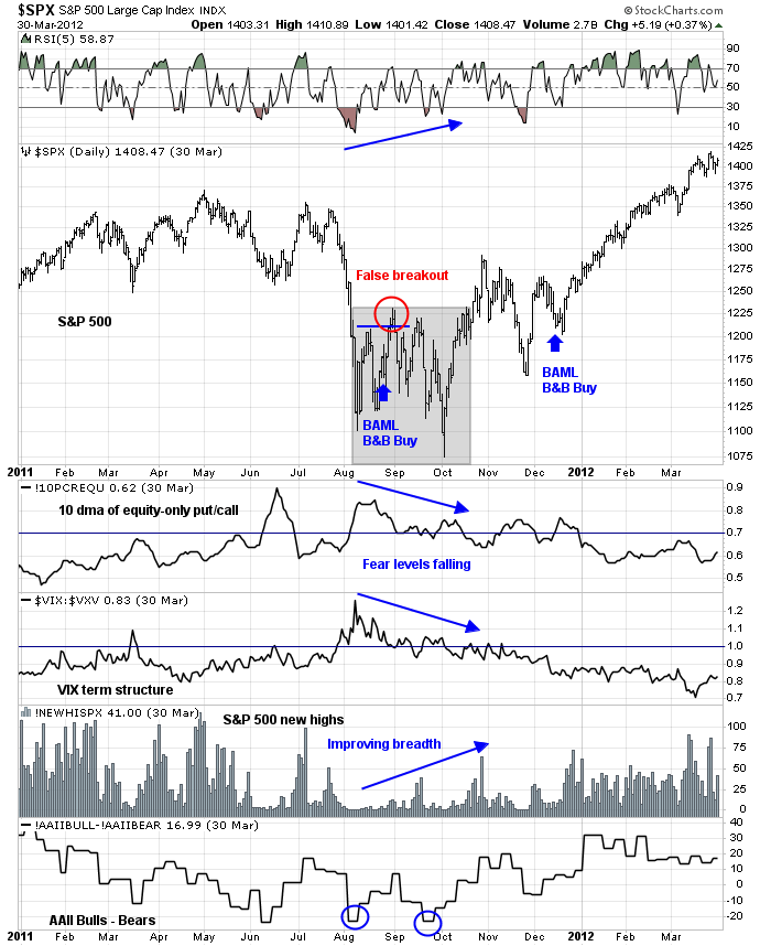 However, the market did stage a false breakout after a month of consolidation in early September. At that time, all of the momentum, sentiment, and breadth indicators were also helpfully bullish. Coincidentally, the BAML Bull and Bear Indicator also flashed a buy signal just before the false breakout. This false breakout was one of the few historical failures of the BAML Buy and Bear buy signal, though the indicator did later flash a useful buy signal in December 2011.