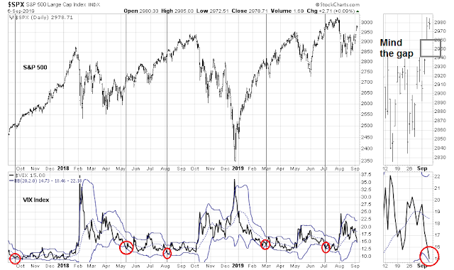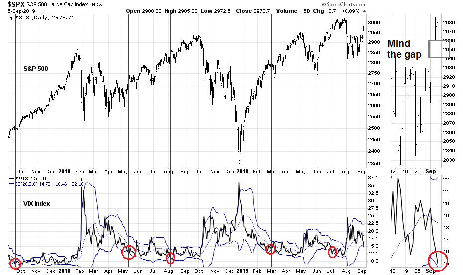 Should the bulls push the market higher early next week, I am tactically watching the behavior of the VIX Index. The VIX almost fell below its lower Bollinger Band on Friday. In the past, such episodes have seen market advances stall, which would represent an opportunity to enter a tactical short position. Another possibility is the index retreats and fills the gap at 2940-2960, which would be a good level to buy if you are bullish.