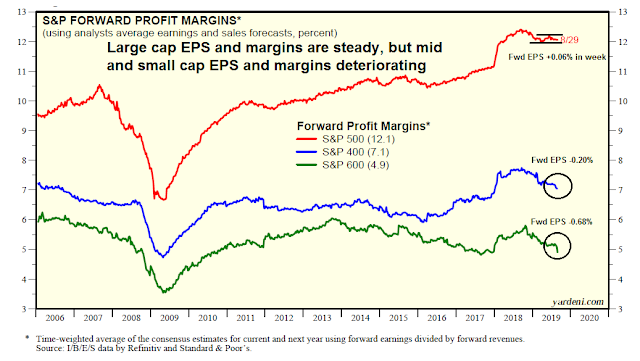 The earnings outlook presents a mixed picture today. Analysis from Yardeni Research, Inc. (YRI) shows that while forward 12-month margins and EPS revisions are flat to up for large cap stocks, they are deteriorating for mid and small caps (annotations are mine, while estimate revision calculations are based on YRI data).