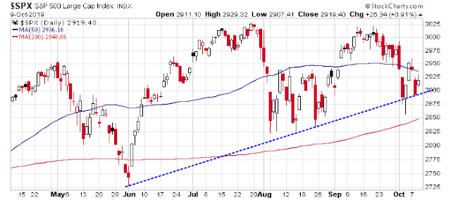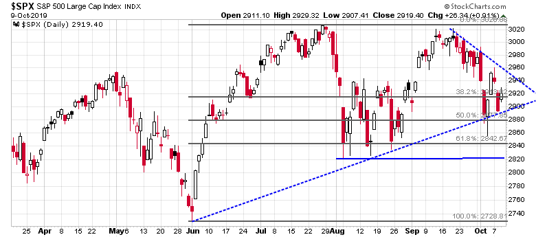 My interpretations of market sentiment and internals lead to a bearish tilt. If I am right, where will the pullback end? Arguably, it could stop at about 2880, or the 50% retracement. If the support from September breaks, the next level of Fibonacci retracement, or roughly in the area of the August lows, or possibly the intra-day August lows at 2820.