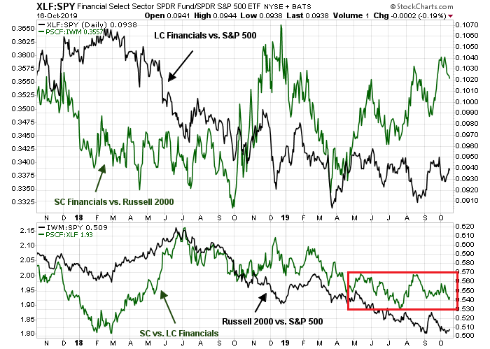 The relative performance of financial stocks tell a similar story as healthcare. While the relative performance of large and small cap financial stocks diverged in the top panel, the relative stability of performance within sector (bottom panel) indicates the divergence was attributable to differences in large and small cap index weights.