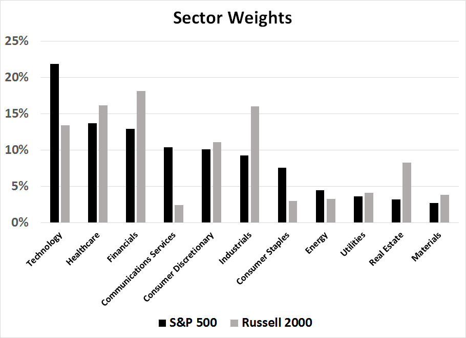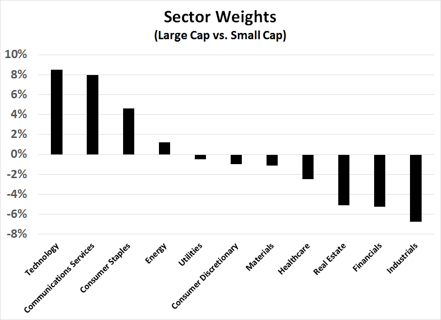 For another perspective, here are the differences in sector weights. Large caps are more exposed to FAANG (Technology and Communications Services), while small caps are more exposed to Industrials, Financials, and Real Estate, which are more interest rate sensitive.