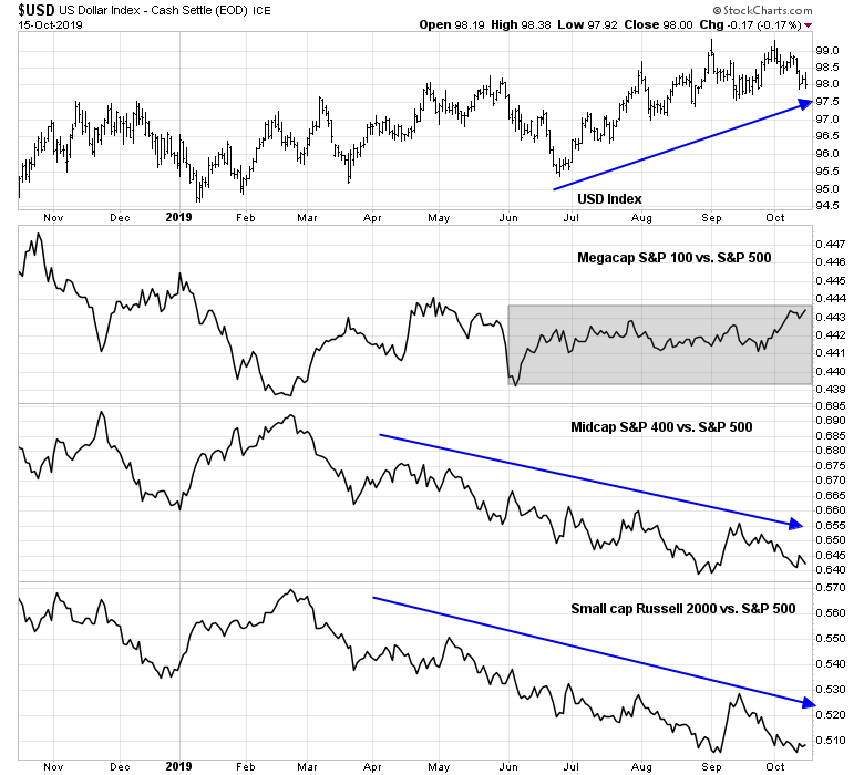 Mid-week market update: One of the investing puzzles that has appeared in the last few months is the mystery of small cap underperformings. The USD Index has been strong over the last three months, which should create an earnings headwind for large cap multi-nationals with foreign operations. Instead, the relative performance of megacaps have been flat to up over this period, while mid and small cap stocks have lagged.