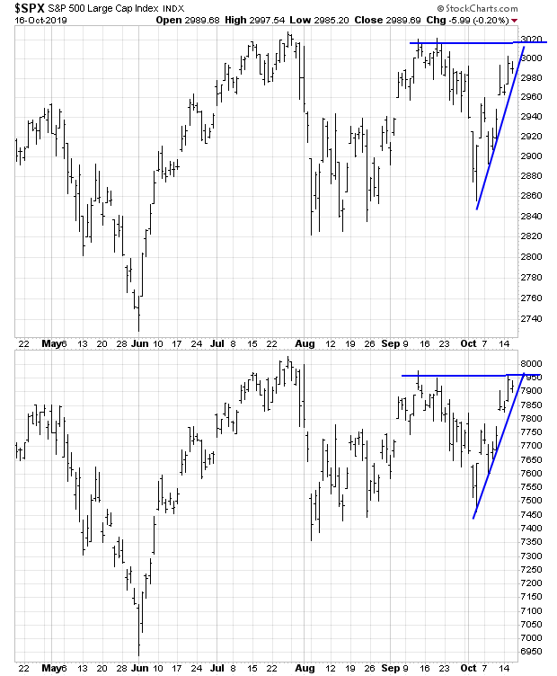 Despite all this, my inner trader isn’t quite ready to throw in the towel on the bear case just yet. Here is the final test. There are some ascending triangles that are evident in the SPX and NDX. They will resolve themselves soon in the next few days by either breaking up, or breaking down.
