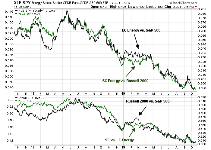 There is not much to say about the energy sector. Both large and small cap sectors are lagging their indices, and small cap energy is underperforming large cap energy.