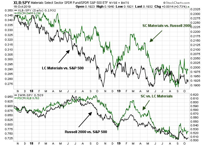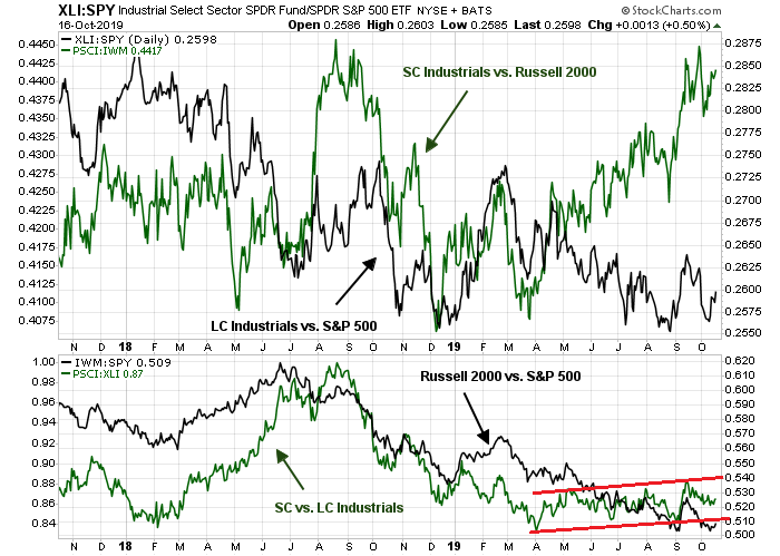 The analysis of industrial stocks reveals some possible cyclical green shoots. Even as the market worried about an economic slowdown, cyclically sensitive small cap industrial stocks outperformed (top panel), and small cap vs. large cap industrial stocks exhibited a slight rising channel (bottom panel). These could be interpreted as unconfirmed and minor “green shoots” of cyclical recovery.