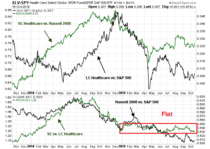The relative performance of healthcare tells a different story. While healthcare stocks have largely underperformed in 2019, small cap relative performance was roughly flat with the market since May. The bottom panel shows that there was no discernible size effect within the healthcare sector, which indicates that large cap healthcare underperformance was attributable to the differences in sector weights of large and small cap indices. In particular, the recovery in technology stocks, which had a heavier weighting in the large cap indices, pushed down the relative performance of the large cap healthcare sector.