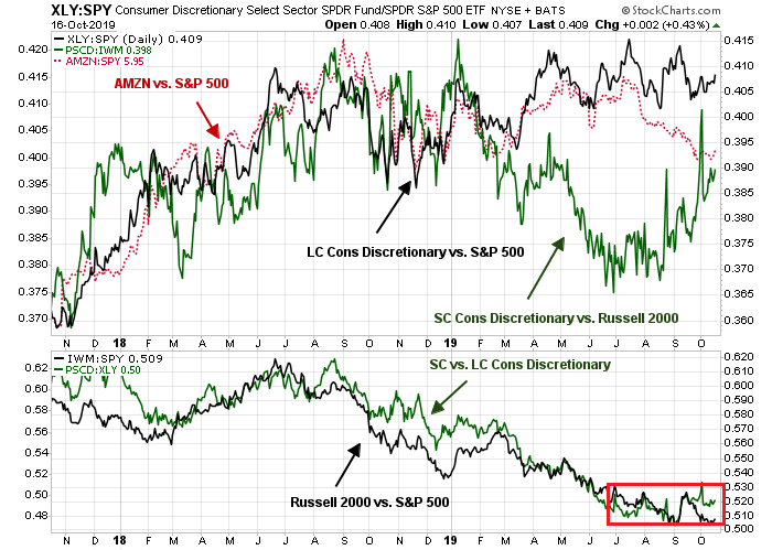 We can distinctly dissect the FAANG effect when analyzing large and small cap consumer discretionary stocks. The top panel shows the usual relative performance of large and small cap consumer discretionary stocks against their respective indices, but I added a red line showing the relative performance of AMZN, which dominates the large cap sector. When the relative performance of AMZN tailed off in the last three months, large cap sector performance was flat, but small cap sector performance soared, and the difference was mainly attributable to one stock, namely AMZN. During the same period, the relative performance of large and small cap stocks within the sector was flat (bottom panel).