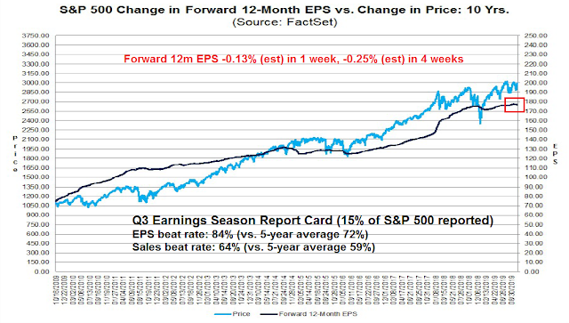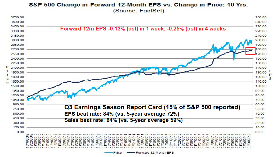 After all, the preliminary results from Q3 earnings season were ahead of expectations. Earnings beats were strong, why didn’t stock prices rally? Further analysis from FactSet revealed that while EPS and sales beat rates were ahead of historical averages, forward EPS estimates were falling, indicating a lack of fundamental momentum.