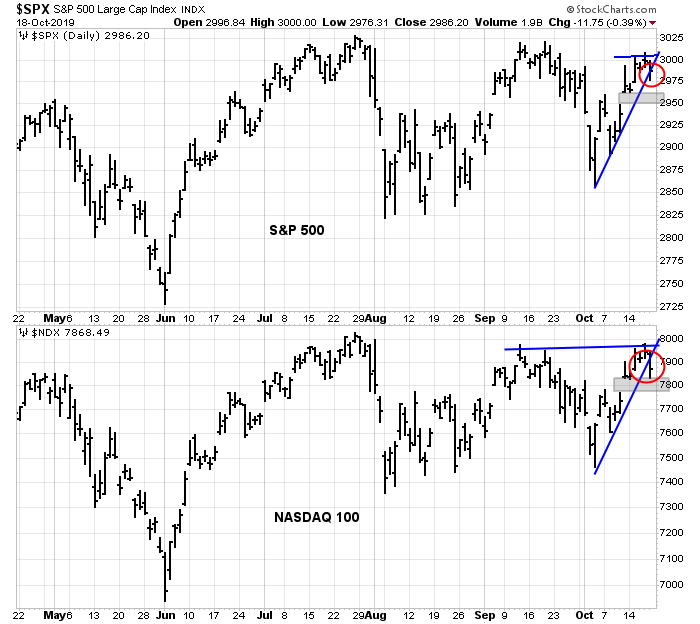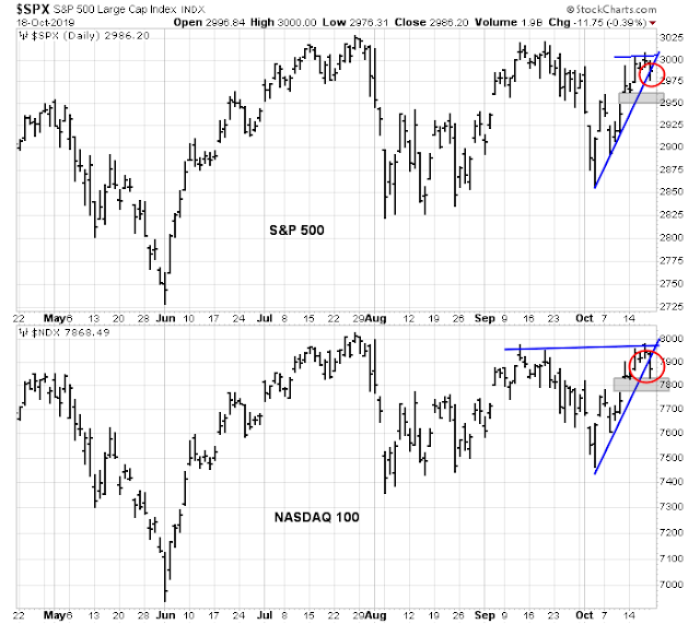 I had identified rising triangles in the SPX and NDX earlier in the week (see Why small caps are lagging (and what it means)), and I wrote that I was waiting for the triangles to resolve themselves. I was ready to pull the trigger on turning bullish from bearish later in the week, but both indices failed to stage upside breakouts. Instead, the two indices broke down through the rising trend line, leaving unfilled gaps below as the first downside targets. The market was exhibiting strong internals, and it had every chance to stage an upside breakout.