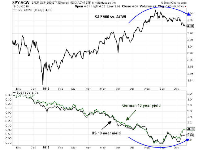In fact, a US-centric analysis could easily have been confused by the better tone to the markets. The latest risk-on tone was sparked by optimism over a possible Brexit deal on October 10, as evidenced by the jump in the GBP exchange rate. Market enthusiasm continued when American and Chinese negotiators ended their meeting in Washington the next day, and the US announced a preliminary trade deal. Simply put, the driver of the latest bull move is non-US, and an analyst focusing on mainly US events would have missed the subtle difference amidst the noise of the trade deal.