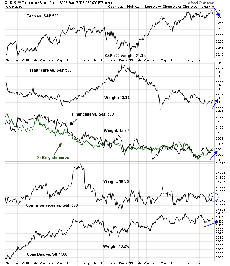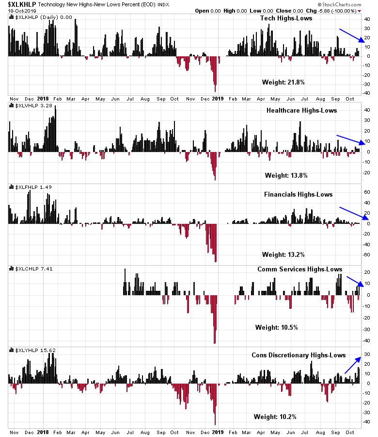 A similar pattern of fading new highs-lows can also be seen in virtually every one of the top five sectors, except for Consumer Discretionary stocks.