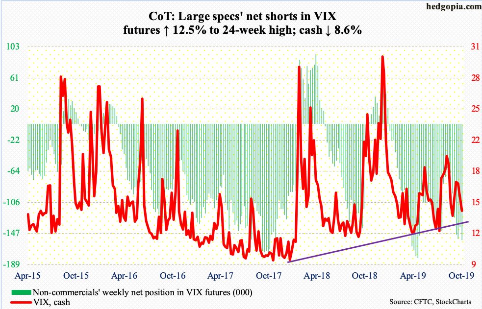 Hedgopia also observed that large speculators’ short positions in VIX futures are highest since April, “Cash itching to rally near term; medium term, tends to peak when these traders get net long, or substantially curtail net shorts.” As this is contrarian bullish for the VIX Index, and VIX is inversely correlated with stock prices, this is a bearish setup for equities.