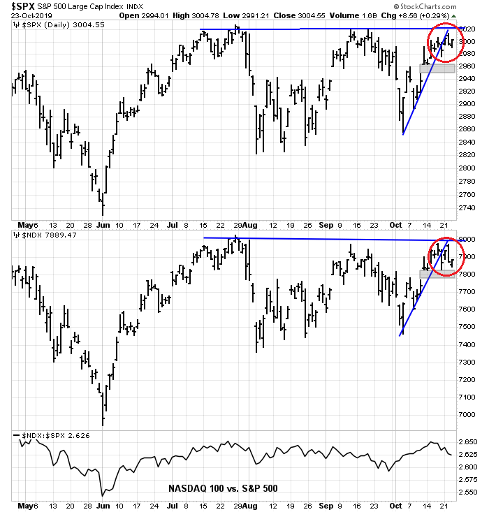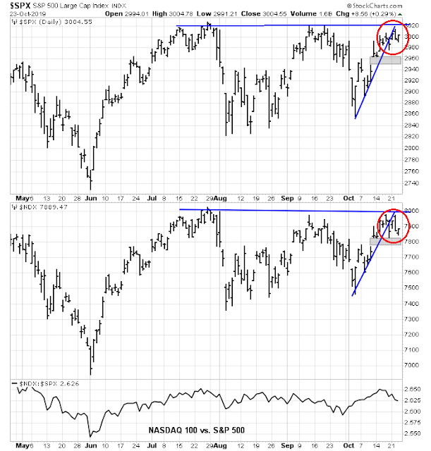 Mid-week market update: At week ago, I identified two technical triangle formations to watch (see Why small caps are lagging (and what it means)). Since then, both the SPX and NDX have struggled at key resistance levels despite a generally positive news background of earnings beats, and now they have moved sideways through a rising trend line. The obvious short-term downside target are the gaps to be filled below (shown in grey).