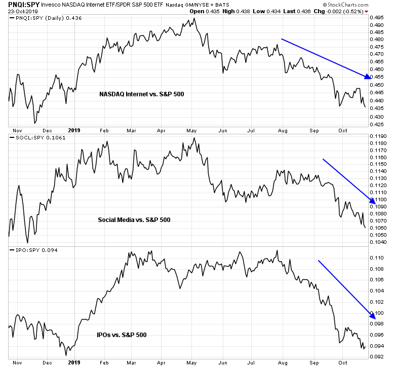 The analysis of the relative performance of the equal weighted top five sectors tells a similar story as the capitalization weighted analysis. As a reminder, equal weighting the stocks in each sector reduces the effect of the large cap FAANG heavyweights. All sectors show the same pattern of relative performance, except for consumer discretionary stocks (bottom panel), which is outperforming were it not for the drag provided by AMZN.