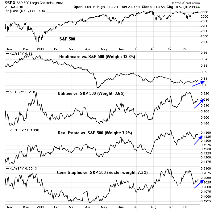 The relative performance of defensive sectors also tells a similar story. Even as the market consolidated sideways, defensive sectors were creeping up in relative performance, indicating the bears were trying to take control of the tape.