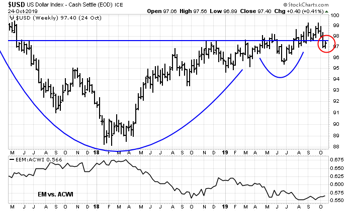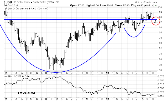 Another recent bullish development for global risk appetite is the weakness in the USD. A rising USD has put strains on the global financial system because of the outsized position of offshore EM and corporate debt. The USD Index staged a breakout out of a bullish cup and handle formation, but it recently retreated below the breakout level, which negates the technical pattern. This should provide a tailwind for emerging markets (EM), but EM stocks are only bottoming on a relative basis.