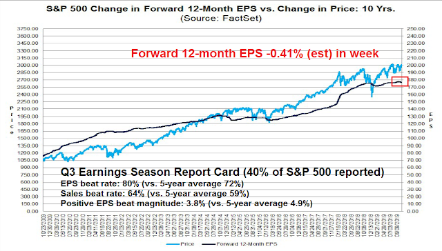 More importantly, the E in the forward P/E is falling, which creates further headwinds for stock prices. Even though the EPS and sales beat rates are well above historical norms, Street analysts are revising down their earnings estimates, and the magnitude of the earnings beats are below average by historical standards.