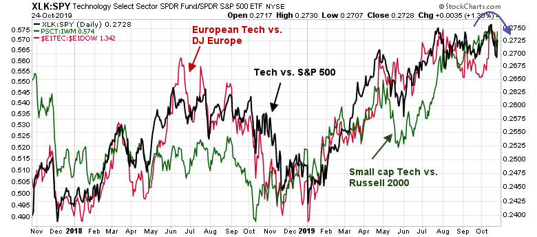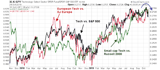 At the same time, the relative performance of technology stocks have begun to roll over. Like the pattern in financial stocks, the relative weakness is synchronized among large cap, small cap, and European technology stocks. Arguably, investors have a lessened need for exposure to this growth sector as a source of growth if global growth expectations are beginning to rise.