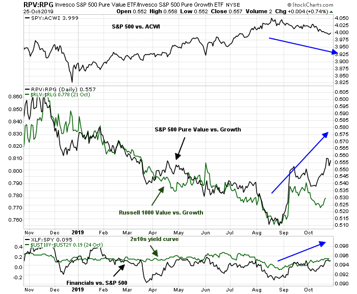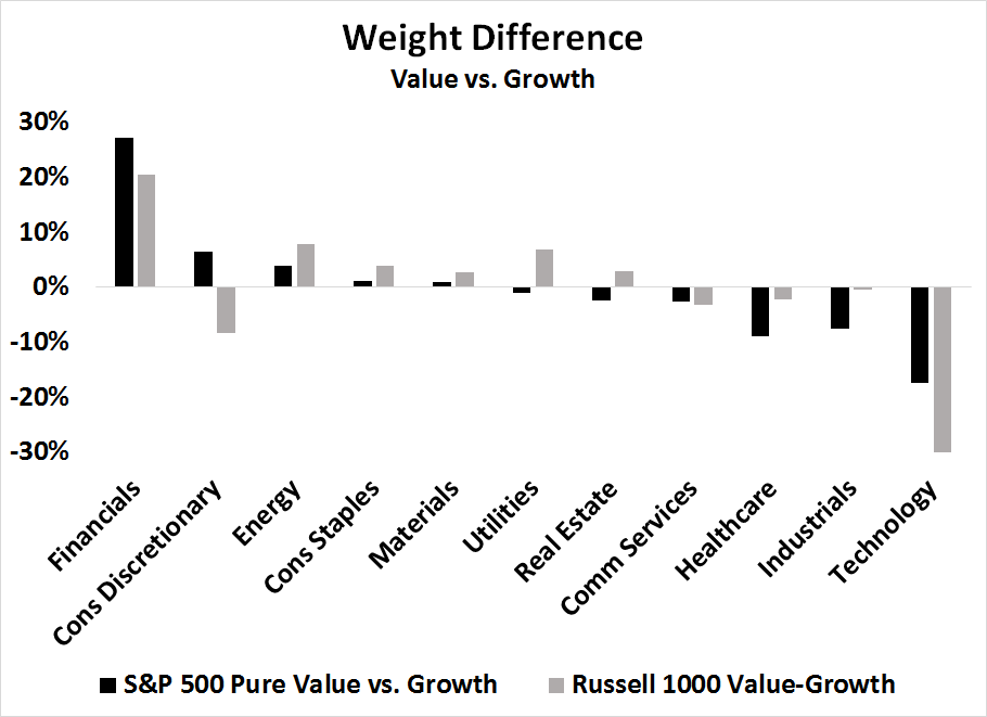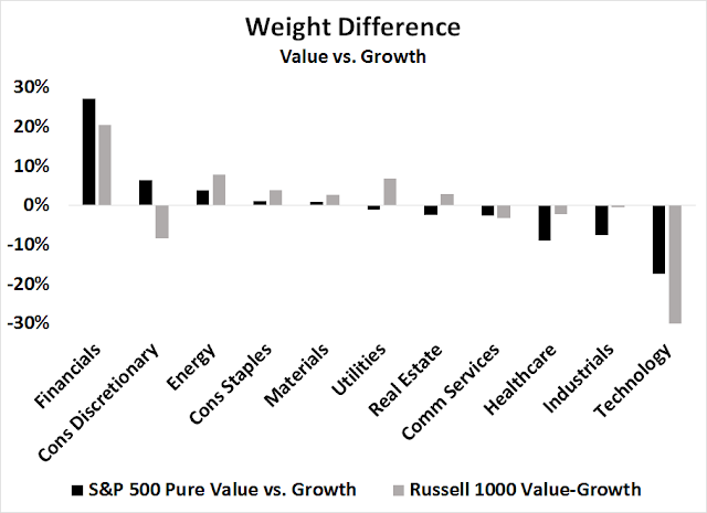 This seismic shift in sector performance has also led to a shift in style returns. An analysis of the pure value and growth indices, as well as the Russell value and growth indices, reveals that the biggest differences is a value overweight in financial stocks, and a growth overweight in technology. For the geeks, a word of difference between the two types of indices is warranted. Both methodologies rank stocks by value and growth characteristics. The pure value and growth indices splits the universe in half, and float weights the stocks in each value and growth group to construct the pure index. The Russell value and growth indices, however, will have index constituent overlaps. That way, a value stock will have 20% of its “normal” weight in a growth index, and vice versa for a growth stock in a value index.