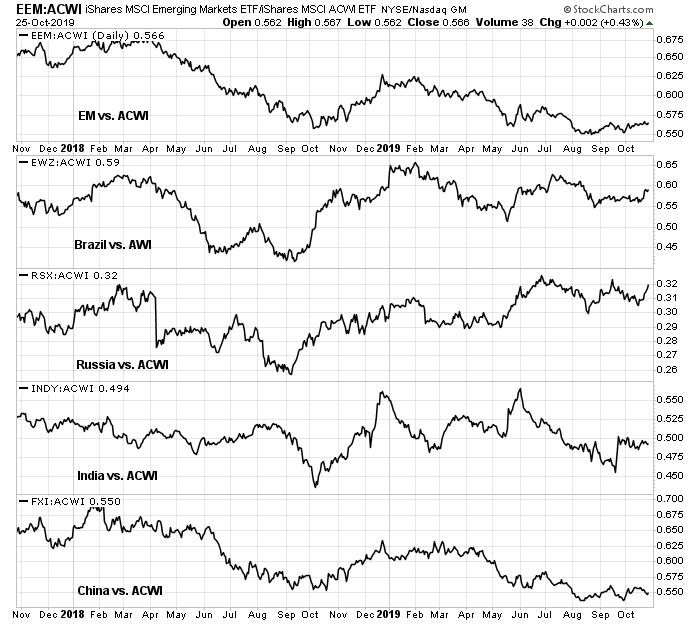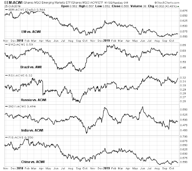 It is probably too early to make a full commitment to EM. The analysis of the relative performance of EM and BRIC countries reveals that two countries (Brazil and Russia) are stabilizing against ACWI, and (India and China) two are still weak. It is too early for EM, wait for some signs of better relative performance.