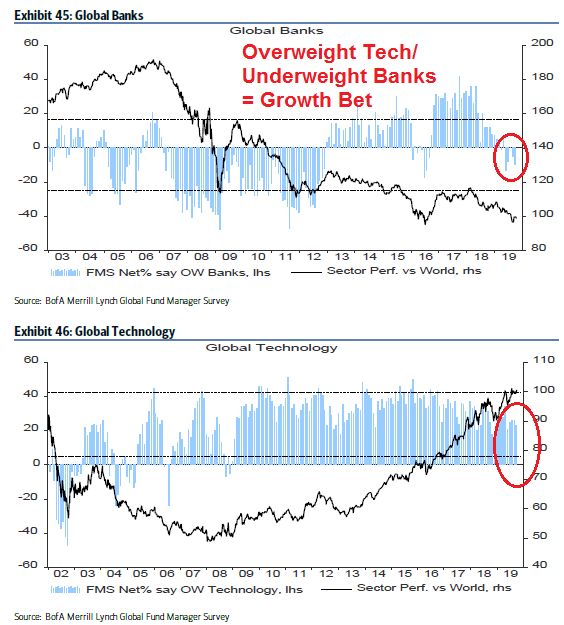 Further analysis of their sector weights shows an underweight position in banks, and overweight in technology. By inference, global institutions have an implicit bet on growth and against value. Should this factor shift continue, watch for them to scramble and reverse those positions.