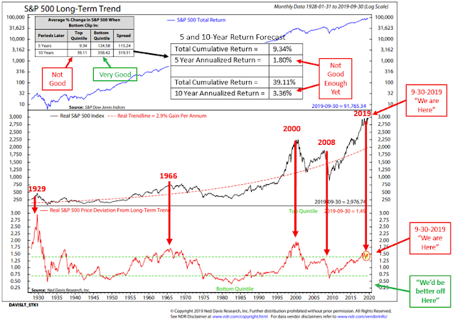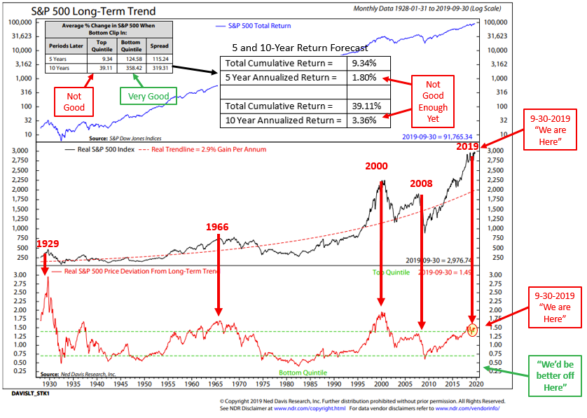 For a longer term perspective, analysis from Ned Davis Research shows that current levels of elevated P/E valuations has resulted in subpar 5-year returns of 1.8% and 10-year returns of 3.4%.