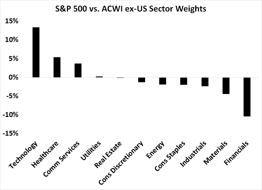 A similar pattern of sector weight differences between value and growth can be found in US and non-US equities. US stocks are far more exposed to technology, while non-US stocks are more heavily weighted in financial stocks.