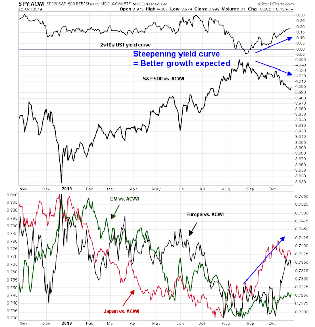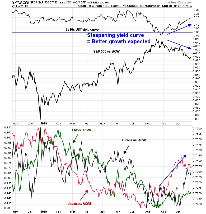 To explain, let us take a factor tour around the world. We begin with the behavior of financial stocks. The relative performance of this sector is historically correlated with the shape of the yield curve. A steepening yield curve is a favorable environment as it benefits institutions which borrow short and lend long. The recovery in this sector is not just limited to the US market. European financial stocks have also been turning up in this environment of better growth expectations.