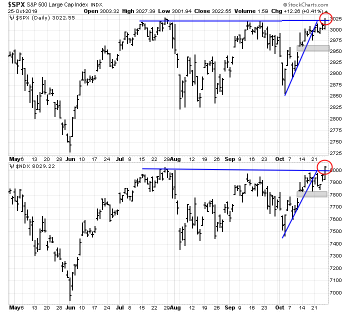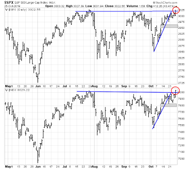From a trader’s perspective, much depends on market action next week. FAANG heavyweight Alphabet will report earnings Monday, with Apple and Facebook reports Wednesday. The FOMC meeting will also end Wednesday, when the Federal Reserve is expected to cut another quarter-point. However, the market expects that this will be the final rate cut for the year. In short, intermediate-term market direction will depend on whether the SPX and NDX can continue to breakout to the upside next week.