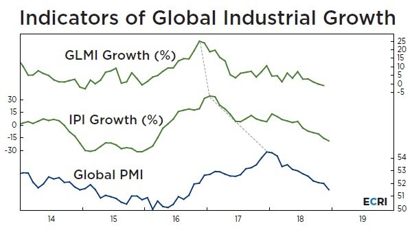 In hindsight, it’s clear that actual global industrial production growth started slowing at the end of 2017. In other words, the year-over-year pace of increase in the world’s total industrial output began a sustained decline in late 2017. That’s the definition of a global industrial slowdown…