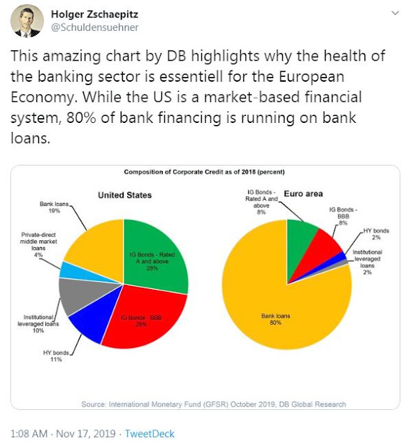 Here is why Europe depends on the fate of the banking sector. This tweet from Holger Zschaepitz of Die Welt reveals that the European economy is far more dependent on bank financing than the US economy, which has undergone a period of financial disintermediation.