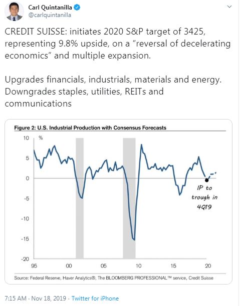 Credit Suisse came out with a similar bullish equity market forecast based on a “reversal of decelerating economics”: