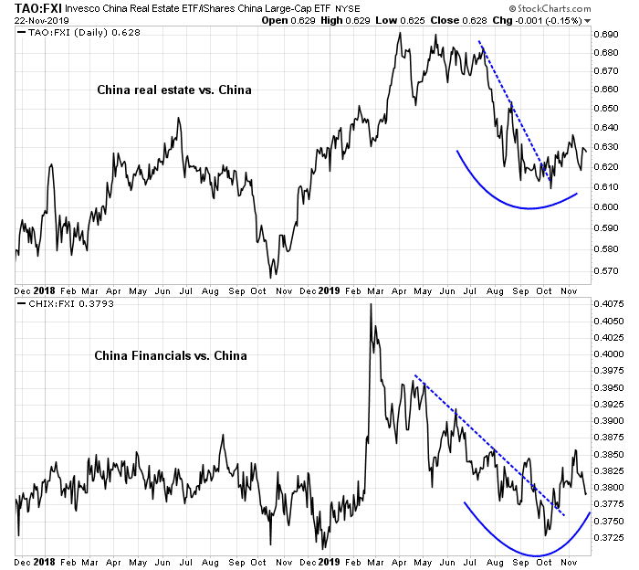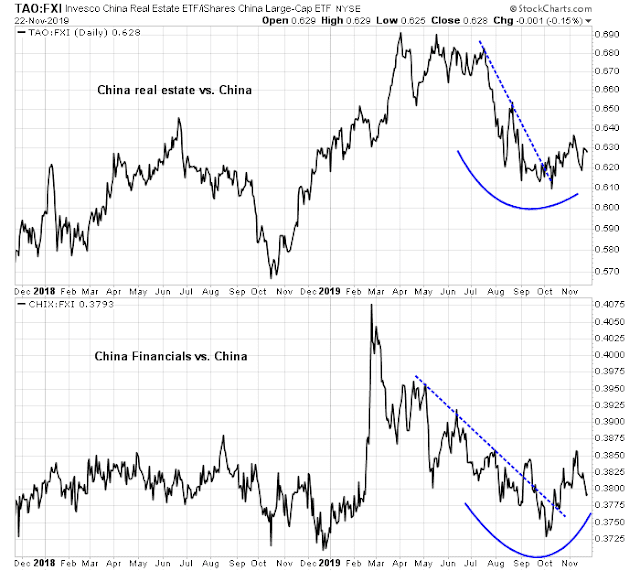 Obviously this raises the degree of risk in the financial system. However, the real-time relative performance of property developers and financial stocks in China are all showing signs of stabilization. As long as these canaries in the financial coalmine remain healthy, tail-risk should remain contained.