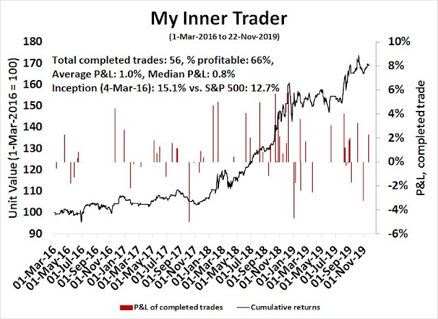 My inner trader uses a trading model, which is a blend of price momentum (is the Trend Model becoming more bullish, or bearish?) and overbought/oversold extremes (don’t buy if the trend is overbought, and vice versa). Subscribers receive real-time alerts of model changes, and a hypothetical trading record of the those email alerts are updated weekly here. The hypothetical trading record of the trading model of the real-time alerts that began in March 2016 is shown below.