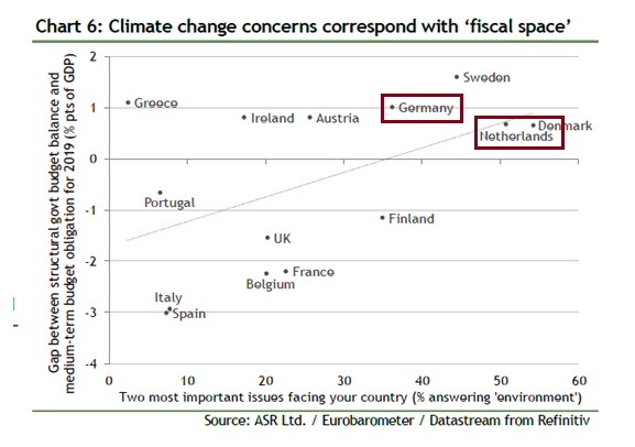 The chart below of European climate change concerns and fiscal space shows that two big northern countries, Germany and the Netherlands, have both the fiscal space and political backing for spending on green projects. This green trend may provide the opening for Christine Lagarde, the new head of the ECB, to lobby for more fiscal spending.